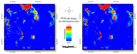 In this formulation, the parameter g defines the width of the kernel and controls the influence of individual training samples. In this study, the gamma value (g) was set to 0.25. A higher g value can lead to overfitting, while a lower value may result in underfitting. The penalty parameter (C) was set to 100.0, which governs the trade-off between maximizing the margin and minimizing the classification error. The classification probability threshold was set to 0.01, meaning that only pixels with a predicted class probability above 1% were assigned to that class. All used SVM parameters have been generated using the parameter optimization tool from the EnMap-Box 2.2.1 tool []. In this study, SVM classification using pyramid level 1was also performed, and the spatial differences were visually compared (Figure 7). However, no significant difference was observed regarding the locations and size of the deformation (anomaly) sites. In pyramid level 0, the resolution of the original data is preserved; in pyramid level 1, analysis/classification is performed with a lower resolution version. The fact that the different pyramid level classification results obtained are not very different from each other shows that the deformation features used for classification in this study are not affected by the scale change. Another feature is that the hyper-plane model created for the SVM classification is sufficiently robust, and has enabled us to obtain similar results at both pyramid levels. In addition, the input data set was considered to have a homogeneous structure against scale change due to the lack of differences between the pyramid levels. The fact that the classification results do not change despite the differences between the pyramid levels indicates that the model is robust to scale changes, and that the features used for classification are determined from general structures. This implies that the model has good generalization ability and gives consistent results at different resolutions. As a result of these, the pyramid level is used as 0 for the SVM classification process.