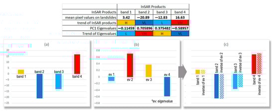 The main logic of the InCROSS analysis is to use a directly related principal component to represent the desired trend for all combined InSAR products. Therefore, the highest values obtained in the single principal component indicate the highest amount of similarity of the desired trend. Figure 8 shows the trend of mean values of deformation areas from original InSAR products (i.e., Band 1: Descending LOS velocities, Band 2: Ascending LOS velocities, Band 3: Vertical (U–D) deformation components, Band 4: East–West (E–W)) and derived principal components from whole data sets. Figure 8a shows the DN values of the deformation areas, and their trends for each InSAR were plotted. Figure 8b shows the PC1 of all products with each eigen value, and the trend of these eigen values are also plotted. Both of them have an inverse relationship, then the inverse of the PC1 were combined in to a graphical representation to show relation and correlation in Figure 8c.