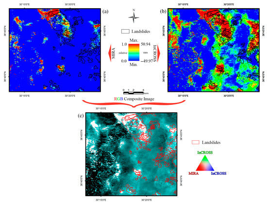 In this study, the deformation information obtained from both innovative methods was compared visually and spatially (Figure 9). In Figure 9a, the red areas correspond to the high deformation fields obtained using the MIRA method. Similarly, in Figure 9b, the red areas correspond to the high deformation fields obtained using the InCROSS method. The deformation results obtained from both methods are presented as an RGB color composite in Figure 9c. In Figure 9c, the R component of the color composite is taken from the MIRA data, while the B–G components are taken from the InCROSS data. In the image obtained in this way, the areas with deformation in both methods are visible as bright reflection values (white). Areas not identified as deformation in either method are shown in dark (black) color. The areas shown in cyan and red colors correspond to the deformation areas identified by InCROSS and MIRA, respectively. The visual comparisons of the two methods employed in this study are illustrated in Figure 9c. The consistency of these two methods was also computed and found to be 80.48%.