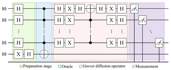 Quantum circuit used for the quantum selection operator (QSO), where the preparation, oracle, Grover diffusion, and measurement stages are presented. The circuit is constructed to implement amplitude amplification, increasing the probability of selecting high-fitness individuals.