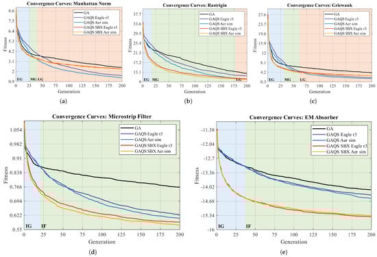 Evolution of the mean fitness value across 200 tests for each algorithm, using both quantum circuit measurement techniques. The following benchmark problems are presented: (a) Manhattan norm, (b) Rastrigin function, (c) Griewank function, (d) Microstrip filter, and (e) electromagnetic absorber. The shaded backgrounds denote convergence phases defined as EGs (early generations), MGs (middle generations), and LGs (late generations) for mathematical functions, and IGs (initial generations) and FGs (final generations) for electromagnetic design problems. Lower fitness values are preferable. All individual optimization runs and the confidence interval of the means are available in Appendix A.