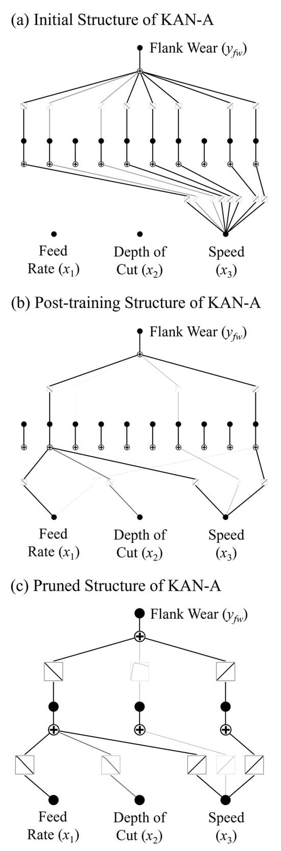 Subsequently, KAN-A/B/C were, respectively, employed to model and predict tool wear in simulated turning operations. All formulas retained four decimal places for precision. The formulas demonstrate the following: