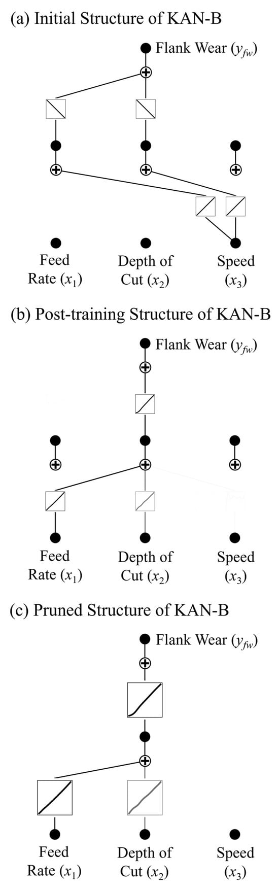 The initial, post-training, and pruned structures of KAN-B are shown in Figure 2. After first loading the training data, KAN-B identified speed (x3) as the most important variable, again influenced by data dimensionality. After training, the increased weights of the feed rate (x1) and depth of cut (x2) demonstrate that the sparse connections from the input layer to the first hidden layer prioritize these two features. After pruning, the nodes and edges of low modeling importance were removed, which makes the relationship between input vectors and output targets intuitive.