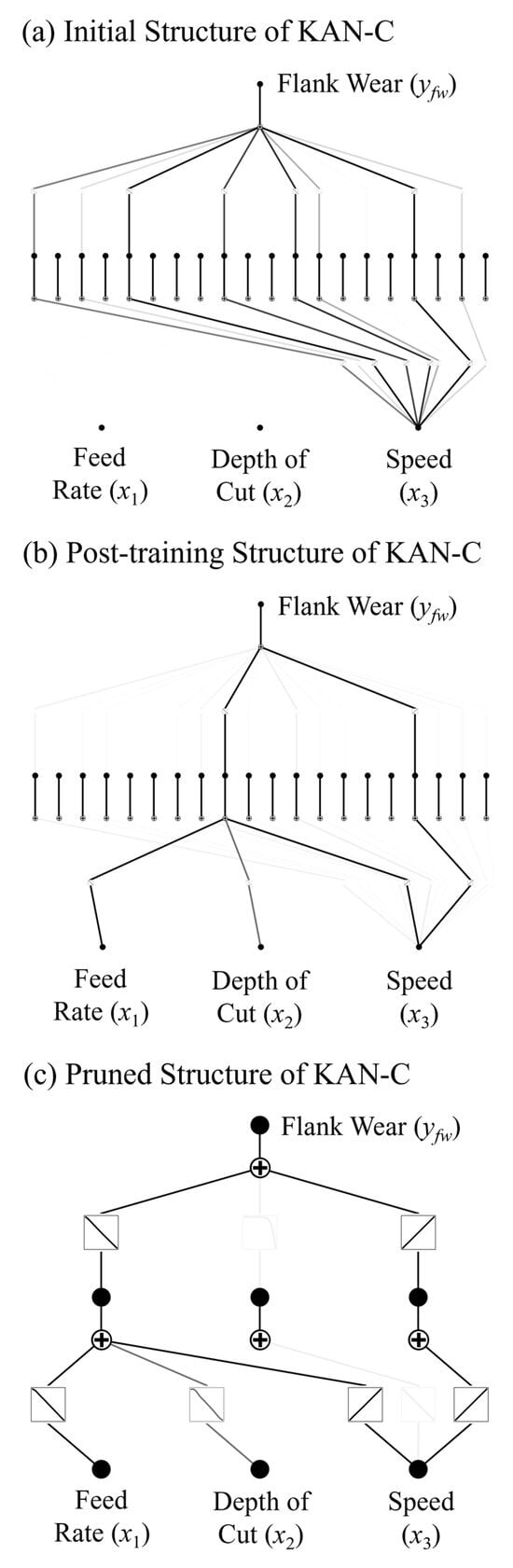 On the other hand, KANs’ characteristics offer new insights for advancing tool wear research. While many traditional models are highly accurate and meaningful, they often rely heavily on empirical formulas or physics-based derivations. Such physics-based models require extensive experimental calibration of parameters. Conversely, KANs adopt a data-driven approach to directly learn the implicit relationships among machining parameters, thereby reducing manual intervention.