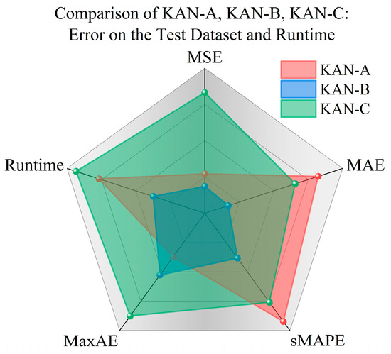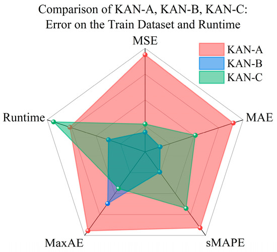 Table 5 presents the experimental results for KAN-A. KAN-A’s test set errors (MSE, MAE, and sMAPE) were marginally lower than the training set values, validating the regularization strategy’s effectiveness and demonstrating generalization. The MaxAE decreased from 0.7555 (training) to 0.3350 (test), which suggests improved prediction of extreme cases.