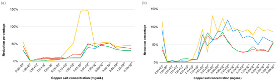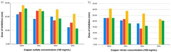 Antibacterial potential of copper salts on different bacterial strains: E. coli ATCC 14169 (blue), E. coli ATCC 25923 (red), E. faecalis ATCC 19433 (yellow), and E. faecalis ATCC 29212 (green). The antibacterial effects were tested using (a) copper sulfate and (b) copper nitrate.