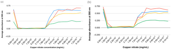 Growth comparison of E. coli ATCC 14169 (blue), E. coli ATCC 25923 (red), E. faecalis ATCC 19433 (yellow), and E. faecalis ATCC 29212 (green) in the presence of (a) copper sulfate and (b) copper nitrate.