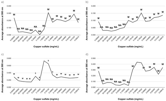 Biofilm formation of bacteria in the presence of copper sulfate (a) E. coli ATCC 14169; (b) E. coli ATCC 25922; (c) E. faecalis ATCC 19433; (d) E. faecalis ATCC 29212. NA—non-adherent biofilm, W—weakly adherent biofilm, M—moderately adherent biofilm, S—strongly adherent biofilm.