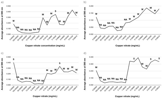 Biofilm formation of bacteria in the presence of copper nitrate (a) E. coli ATCC 14169; (b) E. coli ATCC 25922; (c) E. faecalis ATCC 19433; (d) E. faecalis ATCC 29212. NA—non-adherent biofilm, W—weakly adherent biofilm, M—moderately adherent biofilm, S—strongly adherent biofilm.