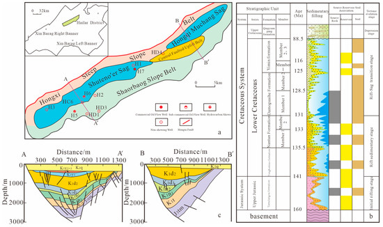 The Hailar Basin is situated in southwestern Hulunbuir, Inner Mongolia, extending from the western shore of Hulun Lake and Bayan Hushu to the east as far as the Yimin River, and from Chenbarhu banner in the north to Beier Lake in the south, extending into Mongolia. It forms part of the Central Asia–Mongolia extension-driven basin system, with the Derbugan Fault marking its boundary. To the west, it belongs to the Erguna fold belt, while to the east, it aligns with the Inner Mongolia–Daxing’anling fold belt. The basin is a superimposed Mesozoic–Cenozoic fault depression developed on a Hercynian fold basement [30,31], experiencing two major evolutionary stages: rifting and sagging [5,32]. During the Jurassic, mantle uplift transformed the tectonic regime from a compressional state to an extensional state, accompanied by extensive volcanic activity [8]. In the Early Cretaceous, the basin reached its peak rifting stage, experiencing distinct evolutionary stages: intense extension during the Tongbomiao Formation deposition, rapid extension during the Nantun Formation deposition, stable extension during the Damoguaihe Formation deposition, and overall uplift and contraction during the Yimin Formation deposition. This period was characterized by active faulting, frequent volcanism, an expanding depositional area, and progressively deepening water bodies, leading to the accumulation of thick sedimentary sequences in the rift center. From the Late Cretaceous to the present, the basin entered a sagging stage, undergoing regional compressional uplift [8]. Under nearly east–west compressional stress, the fault basin experienced structural inversion, resulting in the deposition of a fluvial–swamp facies sequence consisting of conglomerates, sandstones, and mudstones.
