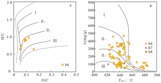 The types of organic matter in source rocks are generally classified into Type I, Type II, and Type III. Different types of organic matter not only exhibit variations in hydrocarbon generation potential but also produce distinct hydrocarbon component characteristics [41,42,43,44]. Based on the elemental analysis of organic matter in the Hongqi Depression, the H/C and O/C atomic ratios, as well as the relationship between pyrolysis Tmax and hydrogen index (IH) (Figure 2), the organic matter in the Jurassic Tamulangou Formation source rocks is primarily composed of Type II and Type III kerogen. This indicates that these source rocks contain both hydrogen-rich components derived from lower aquatic organisms and hydrogen-rich maceral components from higher plants, suggesting a favorable potential for oil and gas generation.