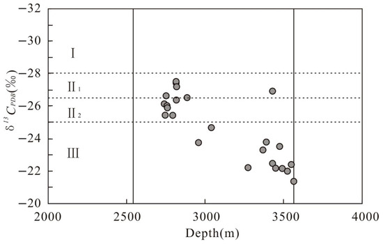 In addition, kerogen carbon isotopes are stable during the diagenetic process and can reflect the original material composition of the organic matter. Therefore, the type of organic matter can be inferred based on the carbon isotope characteristics of kerogen [45,46,47]. The carbon isotope composition of Type I kerogen, derived from algae, is typically light, generally less than −28‰, while Type III kerogen, derived from terrestrial higher plants, has a heavier carbon isotope composition, generally greater than −25‰. Type II kerogen falls between these two. The carbon isotope analysis of kerogen shows that the kerogen carbon isotopes in the dark mudstones of the Tamulangou Formation range from −27.52‰ to −21.37‰, indicating that the organic matter is primarily Type II and Type III (Table 1, Figure 3).