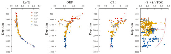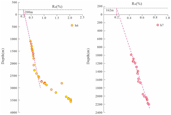 Vitrinite reflectance (Ro) is a primary parameter for evaluating organic matter maturity [48,49,50,51]. In this study, a detailed analysis was conducted on the vitrinite reflectance data from five wells with extensive data in the sag, totaling 90 data points. The relationship between vitrinite reflectance and depth was analyzed in depth, showing a clear linear trend. As depth increases, the vitrinite reflectance values correspondingly increase. The reflectance values are primarily controlled by the maximum formation temperature and burial depth (Figure 4).