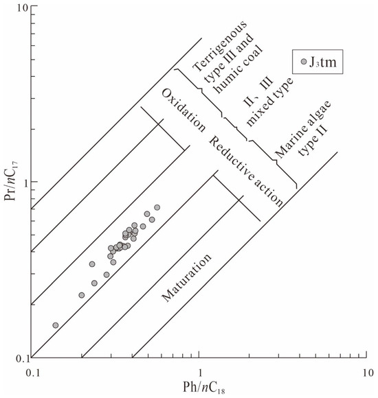 Pr/nC17-Ph/nC18 relationship diagram of source rocks in the Tamulangou Formation, Hongqi Depression.