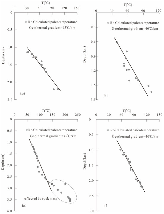 The present geothermal field serves as the basis for restoring the basin’s paleogeothermal field [54,55]. The current geothermal gradient of the Hongqi Depression is 40 °C/km [56]. Based on the relationship established by Barker and Pawlewicz between the maximum burial temperature (Tmax) and vitrinite reflectance (Ro), ln (Ro) = 0.0096Tmax − 1.4, the maximum burial temperature was calculated [57]. As depth increases, the maximum burial temperature also increases, showing a clear linear relationship. The determined paleogeothermal gradient is 40–65 °C/km (Figure 6). The paleogeothermal gradient is higher than the present-day geothermal gradient, indicating that the paleotemperature was higher than the present temperature, and since the Mesozoic, there has been a gradual cooling process [58].