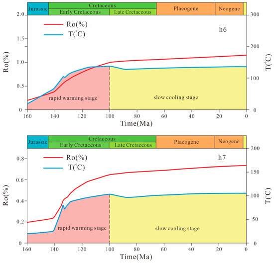 The thermal history simulation indicates that the source rocks of the Tamulangou Formation in the Hongqi Depression have undergone two main thermal evolution stages: a rapid heating phase during the Late Jurassic–Early Cretaceous and a slow cooling phase from the Late Cretaceous to the present (Figure 8). The simulation results reveal certain differences in thermal evolution history across different locations. Well H6, located in the southern part of the Hongqi Depression, shows that the Tamulangou Formation source rocks entered the hydrocarbon generation threshold at 138 Ma, with Ro reaching 0.5%. Around 119 Ma, they entered the hydrocarbon generation peak, with Ro reaching 1.0% and the maximum paleotemperature exceeding 140 °C. At present, they are in a highly mature hydrocarbon generation stage (Figure 9). Well H7, situated in the central part of the Hongqi Depression, indicates that the Tamulangou Formation source rocks reached the hydrocarbon generation threshold at 128 Ma, with Ro reaching 0.5%. Around 74 Ma, they entered the moderately mature stage, which has continued to the present, with Ro reaching 0.7% (Figure 10).