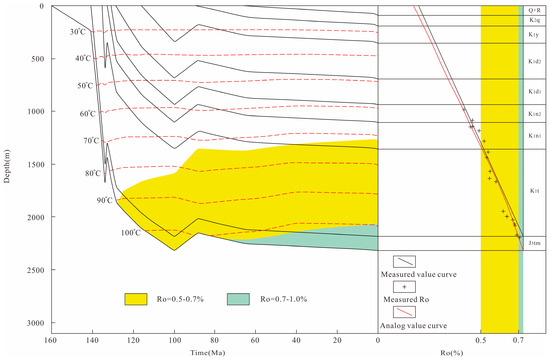 Erosion thickness is the basis for restoring the burial history. Currently, there are many methods to determine erosion thickness, including the acoustic time difference method, the vitrinite reflectance method, and the stratigraphic trend method. Using the acoustic time difference method and stratigraphic trend method, the erosion thickness at the end of the deposition of the Yimin Formation in the Hongqi Depression was determined to be 0–300 m [59], with minimal erosion at the center of the sag and greater erosion at the edges. The erosion thickness determined through vitrinite reflectance in this study ranges from 162 m to 200 m (Figure 7), which is consistent with the erosion thickness obtained using the acoustic time difference method and stratigraphic trend method.