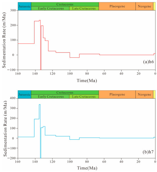 Sedimentation rate diagram of the Hongqi Depression. (a) Sedimentation rate diagram of H6 in the Hongqi Depression; (b) Sedimentation rate diagram of H7 in the Hongqi Depression.