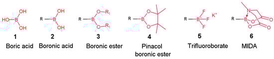 - Hall, D.G. Structure, Properties, and Preparation of Boronic Acid Derivatives: Overview of Their Reactions and Applications. In Boronic Acids: Preparation and Applications in Organic Synthesis, Medicine and Materials, 2nd ed.; Hall, D., Ed.; Wiley-VCH Verlag GmbH & Co. KGaA: Weinheim, Germany, 2011; pp. 1–133. [Google Scholar] [CrossRef]