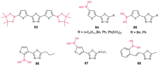 3.3.3. Boronic Acid Derivatives of 1,3,4-Oxadiazol-2-yl-thiophenes, 1,3,4-Oxadiazol-2-yl-furan and 1,3,4-Oxadiazol-2-yl-ethenyl Derivatives