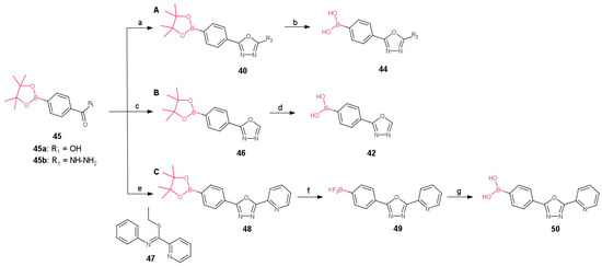 - formation of the 1,3,4-oxadiazole ring from acyclic reagents already containing a boronic ester moiety (method C).