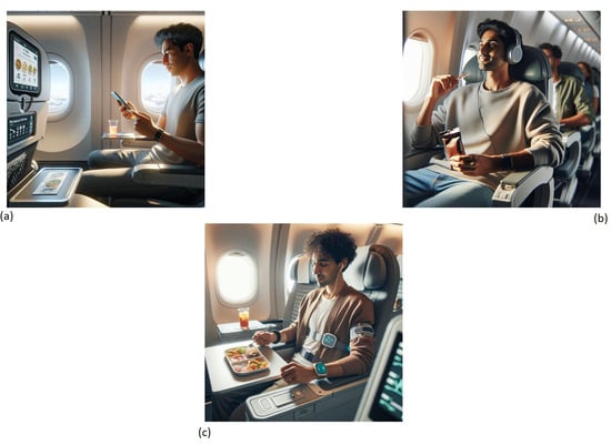 Three possible scenarios related to food to fight the fear of flight onboard: (a) the selection of familiar foods and beverages through an app; (b) the presentation of foods in a multisensory-favorable fashion; (c) the monitoring of well-being during flights during food consumption. (Image generated using the Microsoft 365 Copilot AI tool, https://copilot.microsoft.com/).