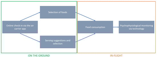 Another proposal to enhance the customer experience related to food, decreasing annoyances onboard for passengers, is represented by the effects of the surrounding environment. The influence of air pressure and sound on self-perception of wellness in the aircraft has already been discussed. Several companies usually propose that their passengers put on earphones to decrease their annoyance due to the engine noise spreading into the cabin [77]; however, through these earphones, sounds could be delivered to the passenger, enhancing the taste of the airline food or improving their overall experience, as has already been demonstrated in different scenarios [78]. The audio tracks used can include the combination of complementary music and food, or even environmental sounds related to food, to enhance the sensory features of edible compounds [79]. The latter approach of these has been followed by some companies, including Finnair [76,80,81], in a successful manner.