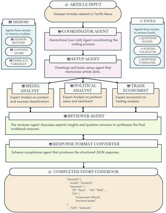 A modular multi-agent architecture was developed for structured news content analysis using LLM-based agents. The system comprises a coordinator agent that orchestrates domain-specific expert agents in media, politics, and economics. This distribution of cognitive load, a principle of distributed reasoning and cognition, assigns each agent a specific role to constrain its interpretive scope, thereby reducing the risk of hallucinations [78,79]. Each of these agents addresses a subset of the 26-question codebook while also providing relevant domain-specific analysis. The analysts agents share the same conversational context to mitigate context dilution and drift across iterative reasoning steps. A reviewer agent discusses and integrates expert responses into a unified output, functioning as a critical internal consistency check. Finally, a converter agent processes the unified output for schema compliance. Memory services, including session and context stores, support state management and inter-agent contextual awareness. Tool modules facilitate access to questions and JSON validation. The agents’ architecture, detailed in Table 3, enables distributed reasoning, profile-specialization-driven analysis, and standardized output generation. The complete agents’ profile and orchestration instructions are presented in Appendix B.2. For the system implementation, Google’s Agent Development Kit version 1.4 was used [80].