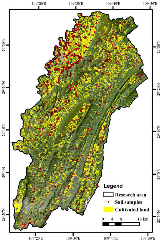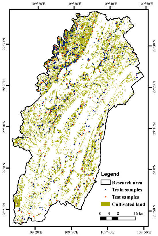 In this study, the 1490 soil samples were divided into a training set and a test set at a ratio of 8:2, resulting in 1192 samples for training and 298 samples for testing. To ensure the fairness of the experiments, samples in both the training and test sets were evenly distributed across the study area, thereby avoiding training bias caused by spatial clustering. The spatial distributions of the training and test samples are shown in Figure 2.
