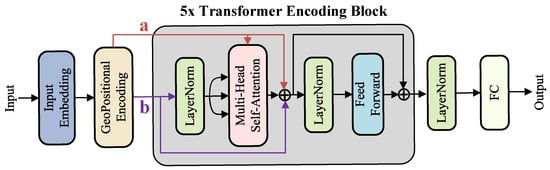 As shown in Figure 3, the GPTransformer branch is built upon a modified Transformer encoder architecture with the integration of a geographic positional encoding mechanism. At large spatial scales, SOM is typically influenced by a combination of macro-environmental factors such as climate and topography, resulting in pronounced spatial heterogeneity [42]. By embedding geographic positional information into the input features, this branch enhances the model’s ability to perceive global spatial heterogeneity, thereby enabling more effective capture of large-scale SOM distribution patterns and the spatial correlations among environmental covariates.