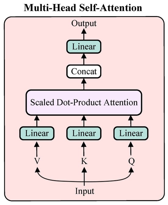The Multi-Head Attention layer is the most essential component of the Transformer encoder module, and its structure is illustrated in Figure 4. First, the queries (Q), keys (K), and values (V) are linearly projected into spaces of dimensions , , and , respectively, where denotes the dimensionality of the query and key vectors, and denotes the dimensionality of the value vectors. These projections are then repeated h times to generate h distinct projected versions (h represents the number of heads in the Multi-Head Attention mechanism). Each projection performs a Scaled Dot-Product Attention operation in parallel, yielding an output of dimension . The outputs from all attention heads are then concatenated and passed through a linear transformation matrix to obtain the final output representation. The computation is defined as follows: