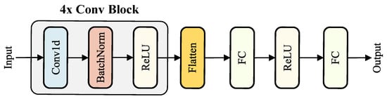 The 1D-CNN branch consists of four convolutional blocks, one flatten layer and two fully connected layers. Each convolutional block includes a one-dimensional convolution module, a BatchNorm layer, and a ReLU activation function. The model parameters are detailed in Table 3. The 1D convolution modules are used to extract local features. The BatchNorm layers standardize the features to accelerate model convergence and reduce the risk of overfitting. The ReLU activation functions introduce nonlinearity, enhancing the model’s representational capacity. The flatten layer is used to convert the multi-channel feature tensor output through the convolution layer into a one-dimensional vector, so that it can be input to the full connection layer for feature fusion and regression prediction. The fully connected layers are employed to integrate features and complete the mapping from the feature space to the output space.