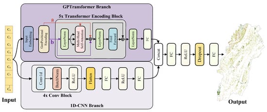 The GPTransformer branch consists of three structural variants: Transformer (with original positional encoding), NPTransformer (without positional encoding), and GPTransformer (with geographic positional encoding). Transformer serves as the baseline model, while NPTransformer is designed to assess the impact of removing positional encoding on model performance. GPTransformer modifies the positional encoding mechanism of Transformer by incorporating geographic location information to enhance the model’s sensitivity to spatial features. The 1D-CNN branch adopts a fixed architecture composed of a one-dimensional convolutional neural network with four consecutive convolutional blocks.