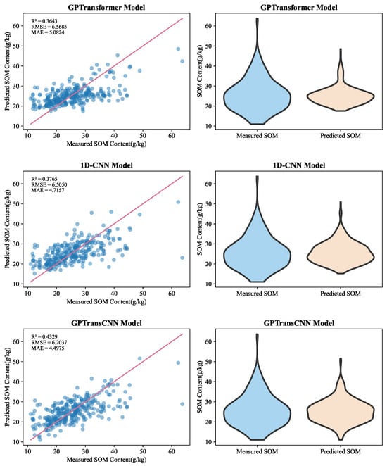 The experimental results are summarized in Table 5, where the GPTransCNN demonstrates the best performance in predicting SOM. To further explore the differences among the predictions of these models, scatter plots and violin plots were generated, as shown in Figure 7.