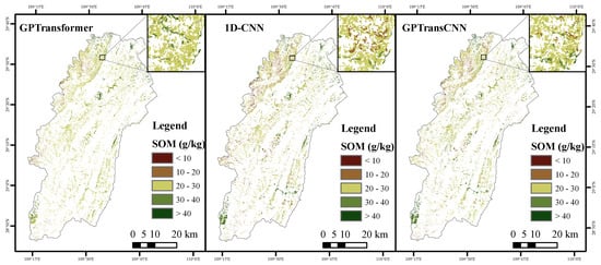 The study area is primarily mountainous, with large undulations and complex terrain, resulting in differences in soil water and heat conditions and vegetation types between different slope positions and orientations, thereby exacerbating the spatial heterogeneity of SOM within cultivated land. To predict the spatial distribution of SOM within the cultivated land of the study area, environmental features across the entire region were used as model inputs. The trained GPTransformer, 1D-CNN, and GPTransCNN models were employed to generate corresponding SOM spatial distribution maps. As shown in Figure 8, SOM concentrations are predominantly in the range of 20–30 g/kg, with higher values mainly distributed in the northeastern and southwestern parts. This spatial differentiation pattern is likely driven by the combined influence of topography, land use types, and human activities.