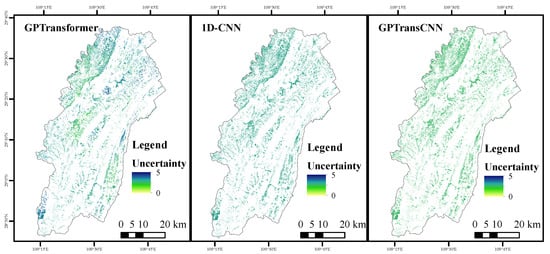 As shown in Figure 10, the spatial distribution of predictive uncertainty for the three models, along with the TRI distribution, is presented. For ease of comparison, a representative spatial region was selected and uniformly applied across all maps. This region was enlarged and displayed in the upper-right corner of each subfigure to provide a clearer visual comparison of both the differences in predictive uncertainty among the models and the correspondence between model uncertainty and TRI distribution. In areas with high TRI values, the predictive uncertainty of GPTransformer increases, indicating its limited capacity to model local features under complex terrain conditions. The 1D-CNN model shows relatively low uncertainty in these areas, indicating its ability to extract local features and adapt to terrain variation. GPTransCNN shows the lowest predictive uncertainty in high-TRI regions, further confirming that its hybrid structure effectively balances global trend modeling and local detail extraction. This enables GPTransCNN to achieve greater stability and robustness under complex terrain conditions.