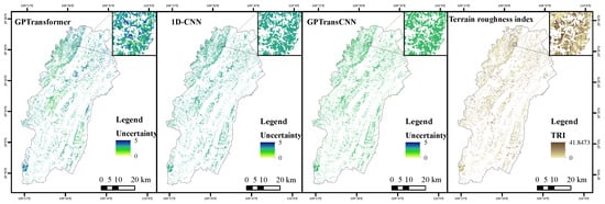 As shown in Figure 9, the predictive uncertainty of GPTransformer exhibits relatively large fluctuations, indicating a certain degree of instability. The 1D-CNN model shows a more stable spatial distribution of predictive uncertainty, with smaller variation. Among the three models, GPTransCNN demonstrates the least spatial fluctuation in uncertainty, reflecting the most stable overall performance. To further investigate the spatial distribution of predictive uncertainty, this study introduced the Terrain Ruggedness Index (TRI) for auxiliary analysis. The TRI is an important indicator used to measure terrain heterogeneity and complexity. It quantifies the elevation differences between a grid cell and its neighboring cells, thereby reflecting the structural complexity and heterogeneity of the terrain. Higher TRI values indicate rougher surfaces and more complex terrain structures [56].