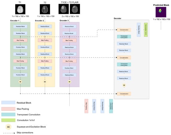 The network is presented in Figure 2. It is characterized by three separate encoders designed to process T1-weighted, T2-weighted, and a combination of T1CE and FLAIR input volumes, respectively. Each encoder consists of two downsampling layers, further involving residual blocks that increase input channels by a factor of two and a max-pooling stage that halves the spatial dimensions. The encoder ends up with two residual blocks and a Squeeze-and-Excitation (SE) block for channel attention [44]. The encoder employed for combined T1CE and T2 FLAIR modalities presents an additional bottleneck stage, where a further downsampling layer allows for fine-grained feature extraction. More specifically, the blocks composing the encoders are shown in Figure 3. Residual blocks are made of 3D convolutional layers with a kernel size of , stride 1, and padding 1, which preserves the spatial dimensions of the input while adjusting the channel depth. Instance normalization and a LeakyReLU activation function are then applied to introduce nonlinearity. Residual connections sum the input directly to the output, facilitating efficient gradient propagation and preserving low-level feature information. The SE block begins with a squeeze phase, where adaptive average pooling is applied to collapse spatial dimensions and retain only channel-wise statistics. During the excitation phase, two fully connected layers reduce then restore the number of channels. This transformation is handled by Gaussian Error Linear Unit (GeLU) activation and a dropout layer (20%) to enhance generalization and prevent overfitting. Finally, a sigmoid activation function is applied to produce normalized channel-wise attention weights, which are used to refine the original feature maps in order to selectively emphasize the most informative channels. The decoder reflects the encoder structure, with three upsampling layers identified by transposed and residual convolutions to incrementally recover the spatial resolution and reduce the number of channels, respectively. Moreover, skip connections are applied to link each encoder and decoder stage at the corresponding depth, preserving both global and local features. The final 3D voxel-wise segmentation map is obtained through a convolutional layer with a kernel size of , stride 1, and three output channels that predict the class probabilities for the enhancing tumor, necrosis, and edema regions.