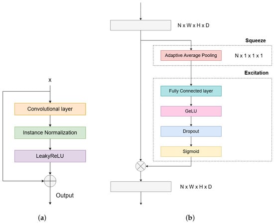 Architectures of the blocks composing the encoder: (a) residual block structure and (b) squeeze-and-excitation block structure.