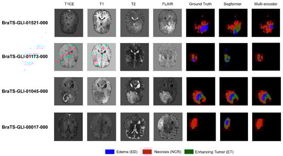 Figure 4 shows four representative cases sampled from the test set, illustrating a qualitative comparison between the segmentation results produced by Segformer3D and our multi-encoder model along with the corresponding ground-truth masks. Qualitative results confirm that both models are overall capable of identifying tumor subregions, although with visible differences in their precision and consistency. For instance, the lower precision for ED and ET achieved by SegFormer3D and highlighted in quantitative analysis is reflected by an overestimation of these regions.