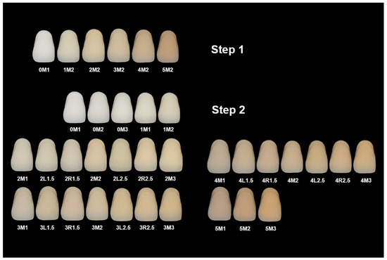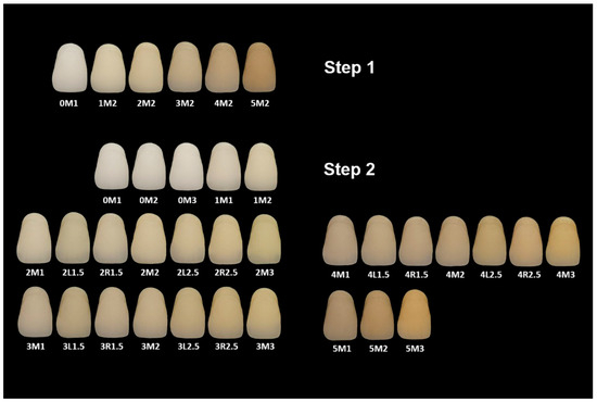 Shade tab images of MC-DSG. The alphanumeric codes below each shade tab indicate the designated shades from the VITA Linearguide 3D-Master system. Step 1 shows the first stage of the shade selection process, where the correct value group (lightness) is determined; Step 2 illustrates that the appropriate chroma level is determined within the selected value group, and slight hue adjustments are made if required to achieve the closest match.