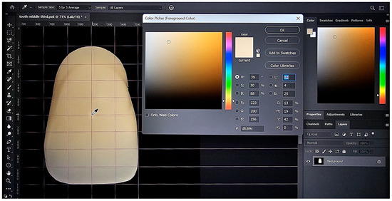 All images captured with the mirrorless camera were saved in RAW file format [38], while those with the smartphone camera were saved in the default JPEG format, with dimensions of 2108 × 2108 pixels, and subsequently converted into bitmap format [39]. All the images from both mirrorless and smartphone cameras were imported into Adobe Photoshop 2023 (version 24.7) for cropping and color value (L*, a*, b*) measurements after white balancing using a standard gray reference card. The brightness of the image was corrected by modifying its exposure until the gray card’s measured luminosity matched its reference value (L* = 75, a* = 0, b* = 0) [19].