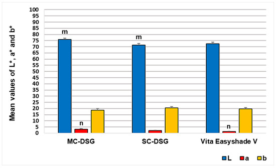 Mean values of L*, a*, and b* of MC-DSG, SC-DSG, and VITA Easyshade V. The error bars indicate the mean ± 1 standard deviation. m significant difference in L* between MC-DSG and SC-DSG, p < 0.05. n significant difference in a* between MC-DSG and VITA Easyshade V, p < 0.05.