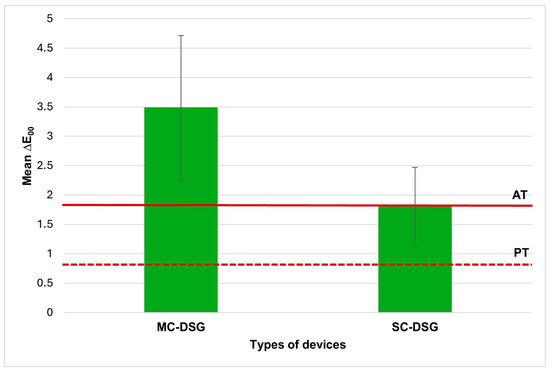 Mean and SD values of the CIEDE2000 color difference (ΔE00) between both MC-DSG and SC-DSG with VITA Easyshade V. The error bars indicate the mean ± 1 standard deviation. The dashed line indicates the perceptibility (PT) threshold (ΔE00 = 0.8), while the solid line marks the acceptability (AT) threshold (ΔE00 = 1.8).