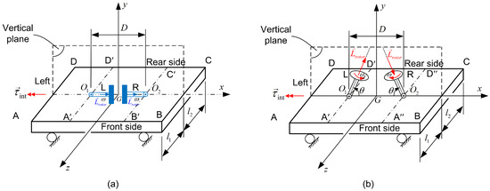 In more detail, we consider a right-handed Cartesian coordinate system originating from the centroid G of a wheeled cart, where y is the upward vertical axis. Let ABCD be the top view of a cart (on horizontal plane ), onto which two contra-rotating gyroscopes are mounted (see, Figure 2). On the upper horizontal surface of the cart, we consider two parallel spindles (with axes and ) which contra-rotate in their corresponding cages firmly connected to the cart. Perpendicular to each of these two shafts, the axle of the corresponding gyroscope is pivoted, with the first () at the left shaft and the second () at the right shaft . In other words, the illustrated symbols (L) and (R) refer to the left and right spinning wheels, respectively.
