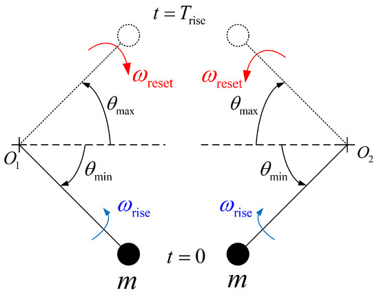 In the beginning of each cycle (period) at time , both axles ( and ) are simultaneously found at a polar angle and progressively move upward until the position at time . In this upward phase, the mean average angular velocity is . To give priority to the rising phase, the gyroscopes’ axles return to their initial position at a lower speed (i.e., ), which obviously has a negative sign (i.e., ). The procedure is schematically shown in Figure 5.