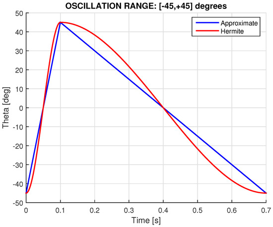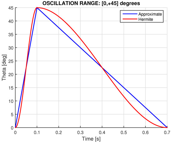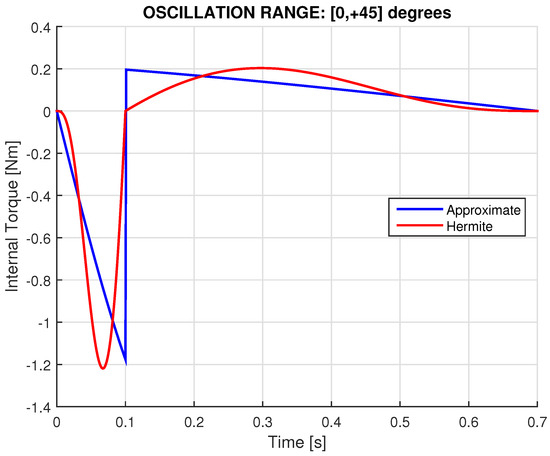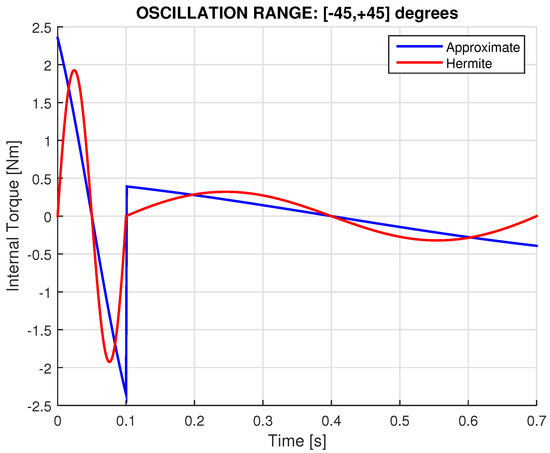 Furthermore, for both models, the variation in the internal torque is illustrated in Figure 8. One may observe that the approximate model could not accurately simulate the initial (zero) angular velocity, but in general, it was in good accordance with the Hermite model.
