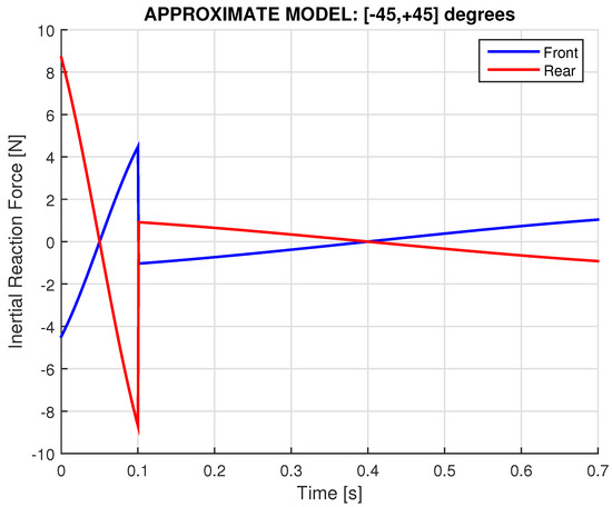 Keeping the same durations, i.e., and , for both models, the same results as those of Section 3.4 are illustrated in Figure 11, Figure 12, Figure 13, Figure 14 and Figure 15. Since the duration of the rise phase remained the same for a halved angle, the average angular velocity and the internal torque were reduced by half. At the end, it can be observed that the rear support exhibited more negative values with larger absolute magnitudes, which gives the impression that the front support’s magnitude increased, while that of the rear support decreased.