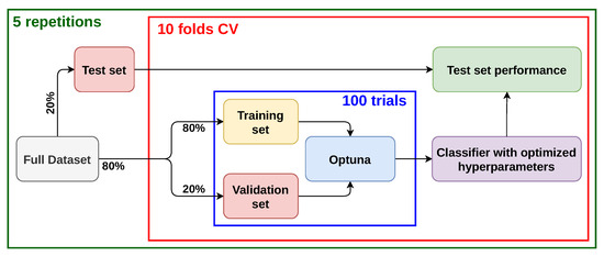 Since the numerosity of the dataset is limited, we performed repeated stratified cross-validation (CV). In particular, we repeated the CV five times, with the test set size constituting of the dataset, so that the test sets in each repetition would be independent. The test set was employed for final evaluation, whereas the rest of the dataset was used for a 10-fold CV, according to which we further divided the data into training and validation sets. These splits were performed in a stratified fashion so that the class balance would be preserved. At this point, some of the classifier’s hyperparameters were optimized using the software Optuna (version 4.2.0) [22], with classification accuracy being the metric to be optimized. This was achieved by performing multiple trials. We performed 100 trials per fold to ensure that the optimization method would converge to the best set of hyperparameters.
