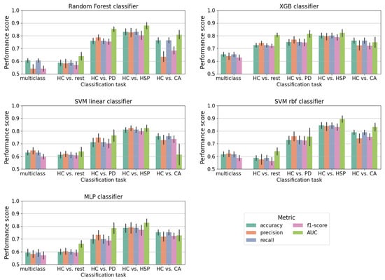 By using only the gait parameters as input, the classifiers achieved optimal performance in distinguishing healthy subjects from people affected by a specific neurodegenerative disease, particularly in the case of Parkinson’s disease (PD) and hereditary spastic paraplegia (HSP), as shown in Figure 2.